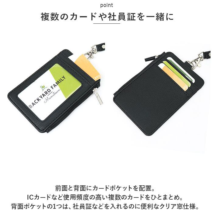 ・前面と背面にカードポケットを配置。ICカードなど使用頻度の高い複数のカードをひとまとめ。背面ポケットの1つは、社員証などを入れるのに便利なクリア窓仕様。