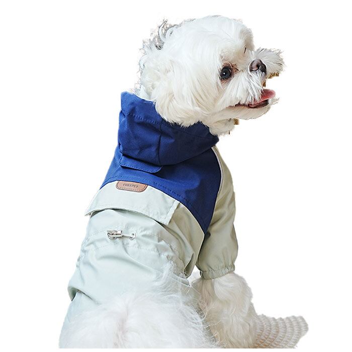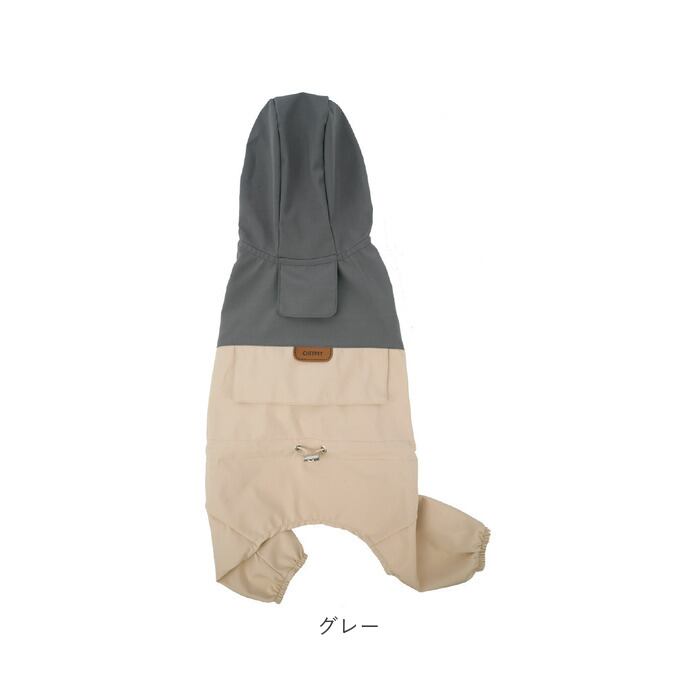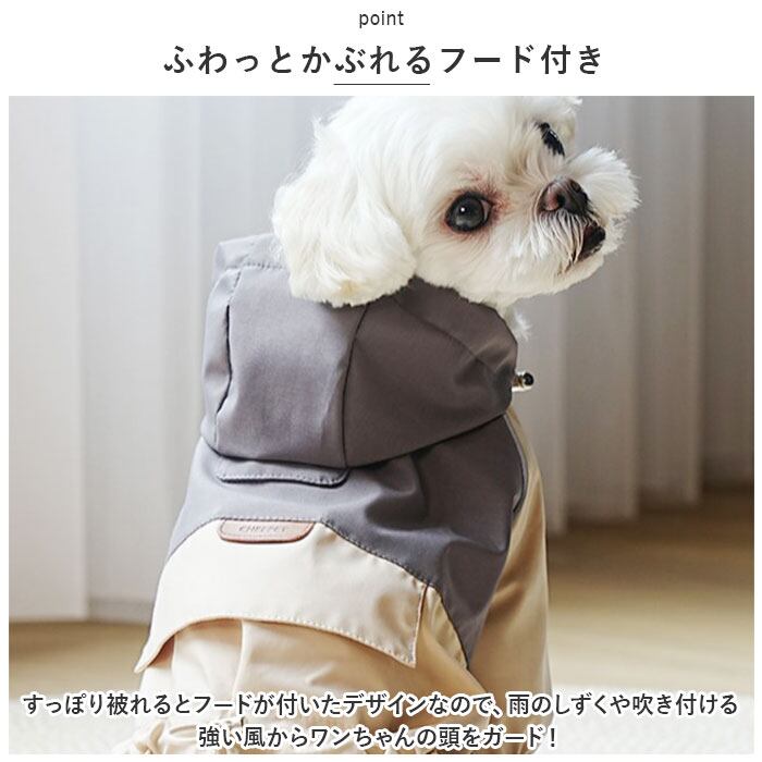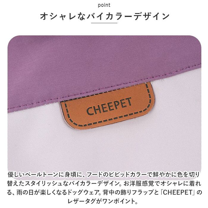 ・優しいペールトーンに身頃に、フードのビビッドカラーで鮮やかに色を切り替えたスタイリッシュなバイカラーデザイン。お洋服感覚でオシャレに着れる、雨の日が楽しくなるドッグウェア。背中の飾りフラップと「CHEEPET」のレザータグがワンポイント。