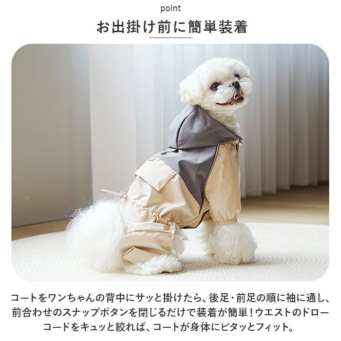 ・コートをワンちゃんの背中にサッと掛けたら、後足・前足の順に袖に通し、前合わせのスナップボタンを閉じるだけで装着が簡単!ウエストのドローコードをキュッと絞れば、コートが身体にピタッとフィット。