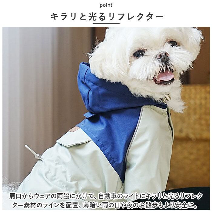 ・肩口からウェアの両脇にかけて、自動車のライトにキラリと光るリフレクター素材のラインを配置。薄暗い雨の日や夜のお散歩もより安全に。