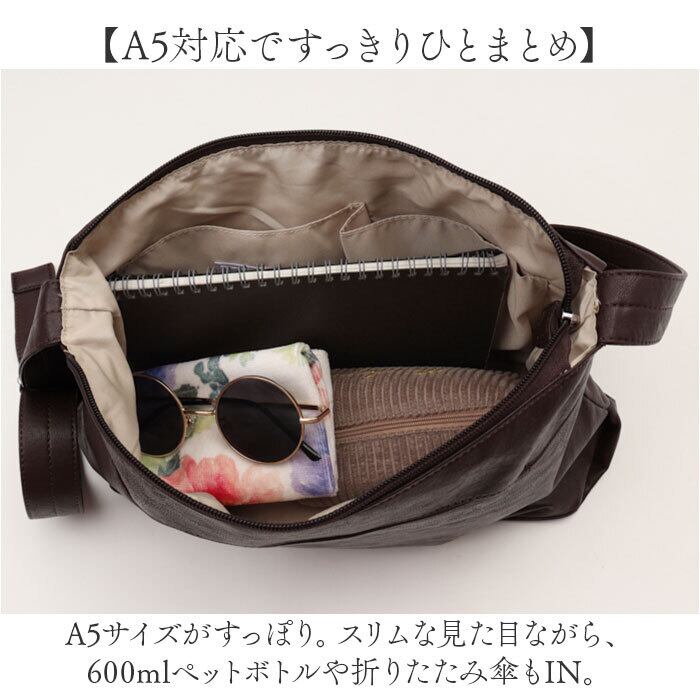 ・A5サイズがすっぽり。スリムな見た目ながら、600mlペットボトルや折りたたみ傘もIN。