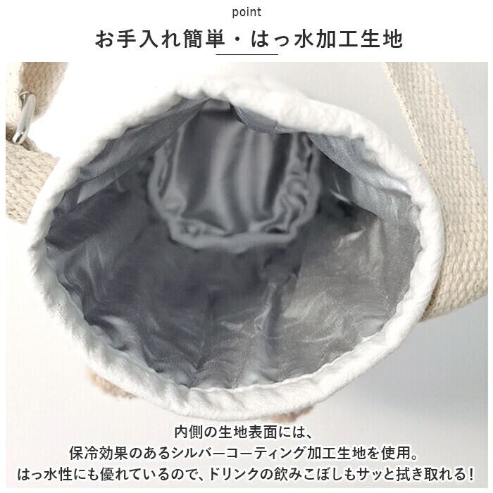 ・内側の生地表面には、保冷効果のあるシルバーコーティング加工生地を使用。はっ水性にも優れているので、ドリンクの飲みこぼしもサッと拭き取れる!