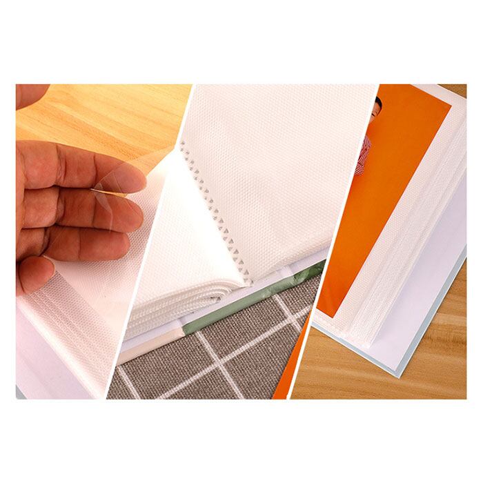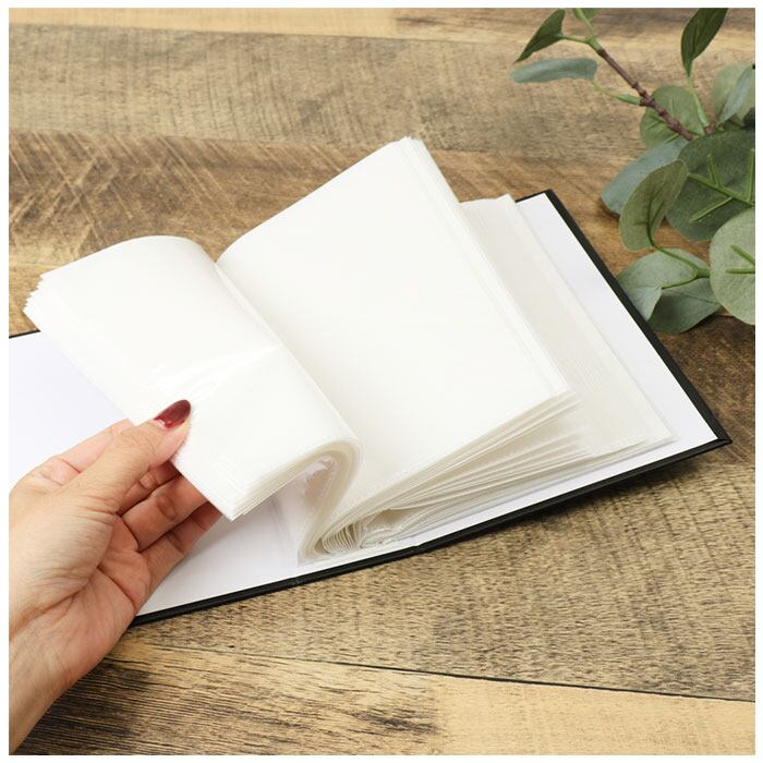 1ページに1つのポケット付き。見開きで2枚、合計100枚のはがきを収納可能な大容量タイプ。入れ替えもラクラク。