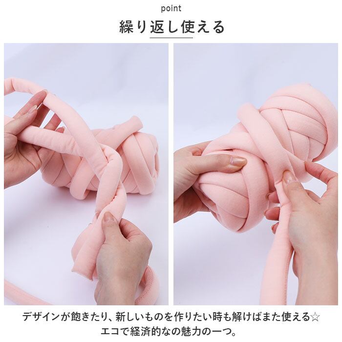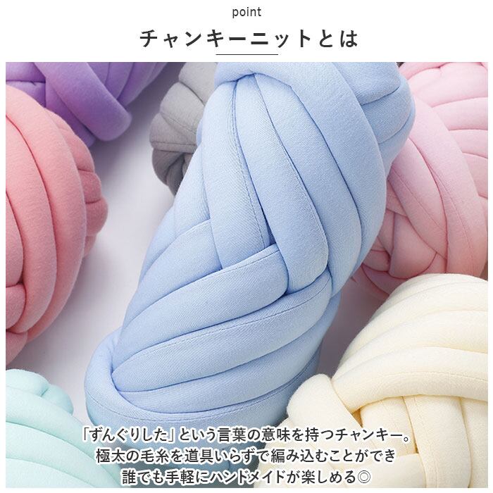 「ずんぐりした」という言葉の意味を持つチャンキー。極太の毛糸を道具いらずで編み込むことができ誰でも手軽にハンドメイドが楽しめる◎