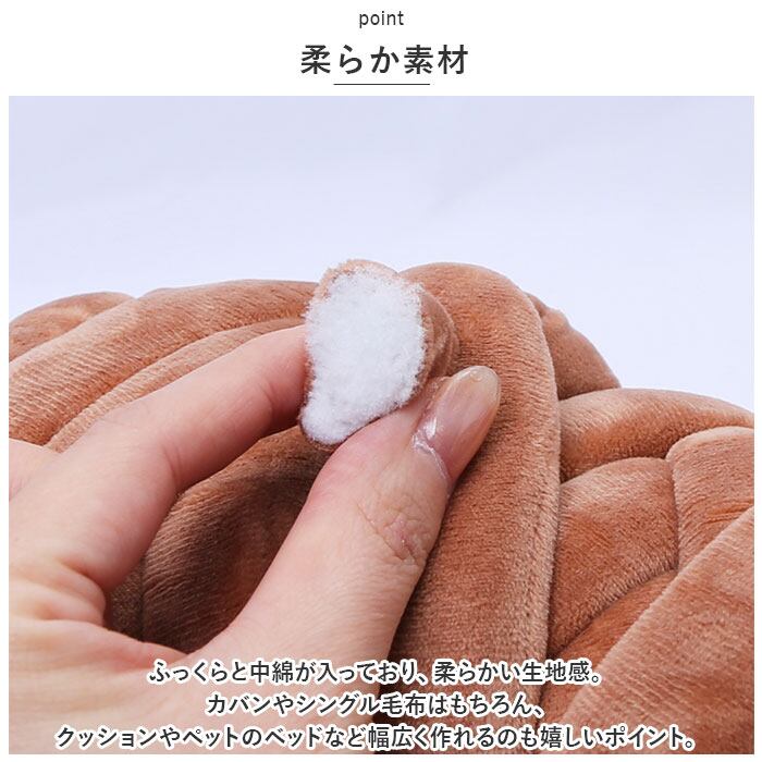 ・ふっくらと中綿が入っており、柔らかい生地感。カバンやシングル毛布はもちろん、クッションやペットのベッドなど幅広く作れるのも嬉しいポイント。