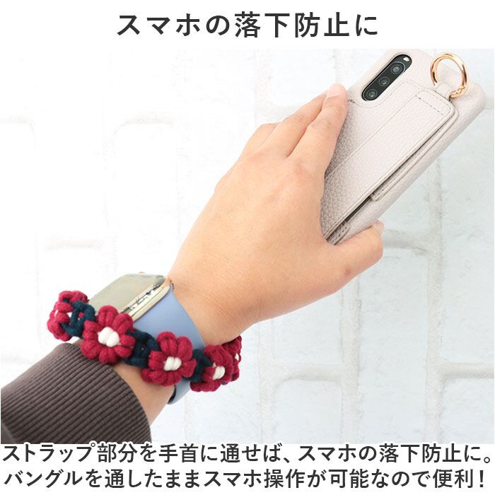 ・ストラップ部分を手首に通せば、スマホの落下防止に。バングルを通したままスマホ操作が可能なので便利!