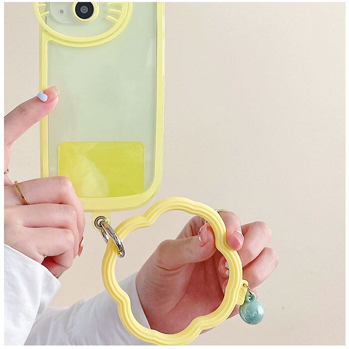 ・腕に通せるリングでスマホの落下対策はもちろん、手提げのように持ち運べるのもポイント。
