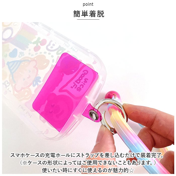 ・スマホケースの充電ホールにストラップを差し込むだけで装着完了。(※ケースの形状によってはご使用できないこともあります。)