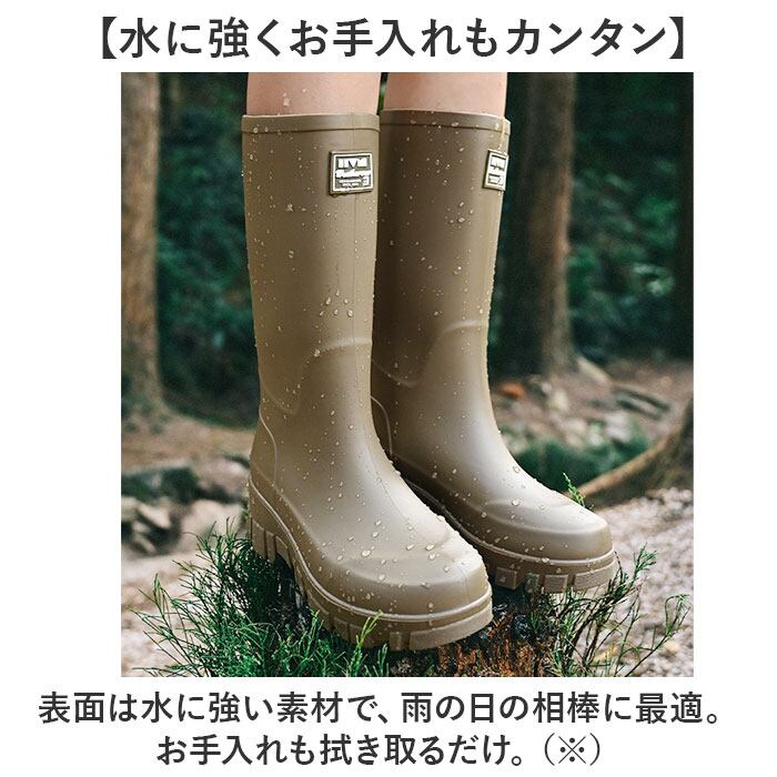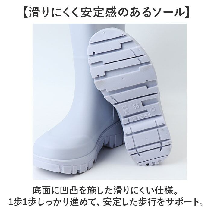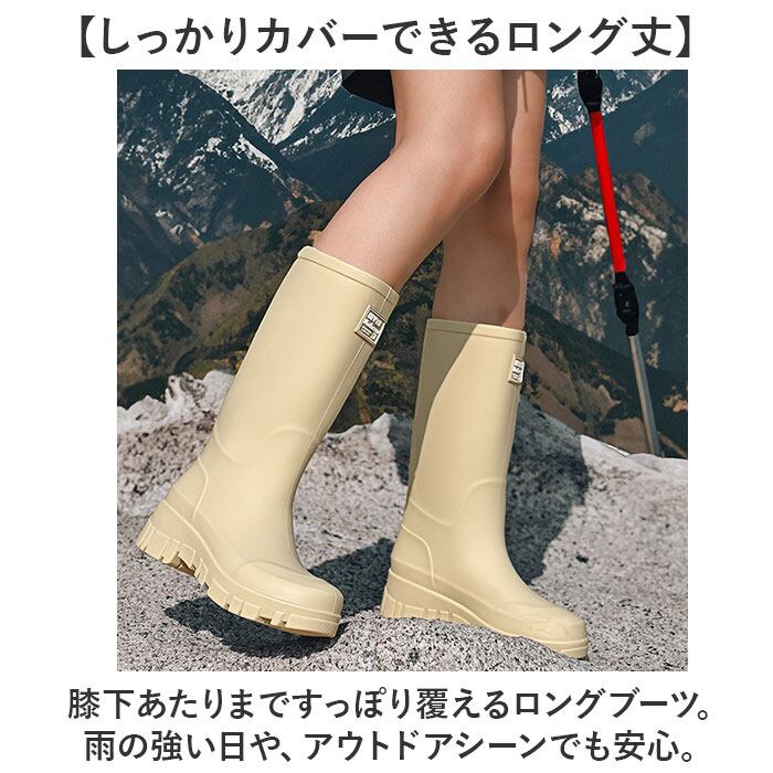 ・膝下あたりまですっぽり覆えるロングブーツ。雨の強い日や、アウトドアシーンでも安心。