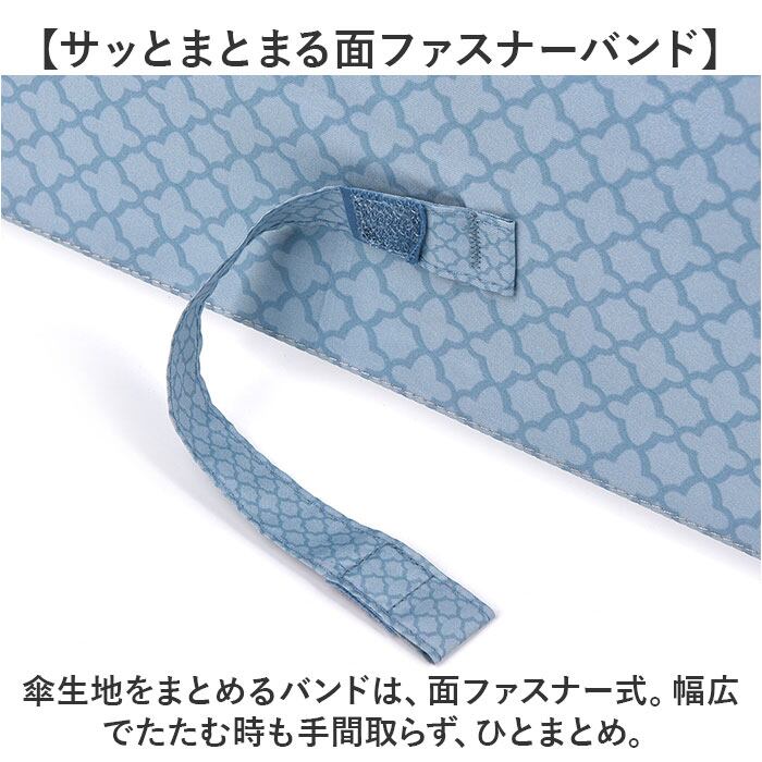 ・傘生地をまとめるバンドは、面ファスナー式。幅広でたたむ時も手間取らず、ひとまとめ。