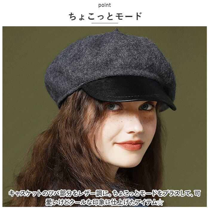 ・キャスケットのツバ部分をレザー調に。ちょこっとモードをプラスして、可愛いけどクールな印象に仕上げたアイテム☆