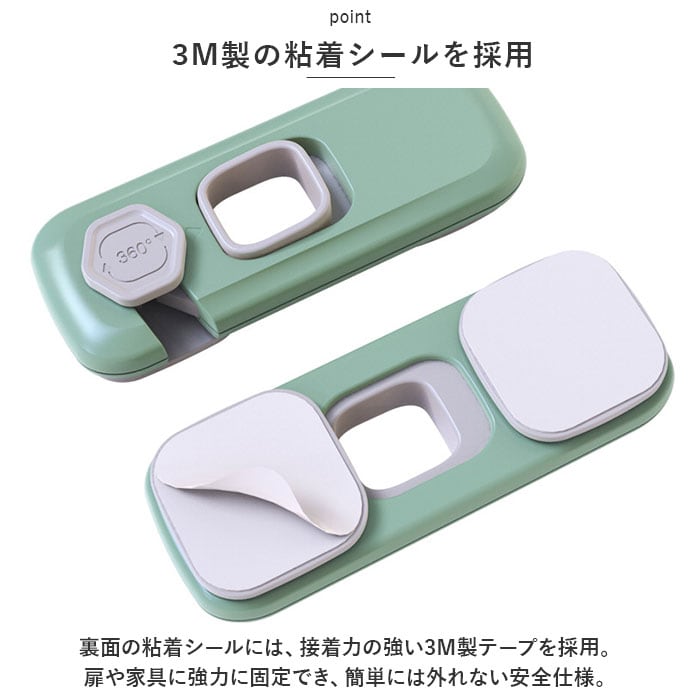・裏面の粘着シールには、接着力の強い3M製テープを採用。扉や家具に強力に固定でき、簡単には外れない安全仕様。