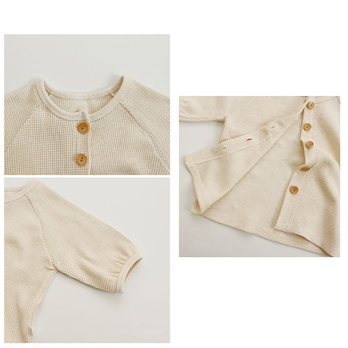 ・簡単に脱ぎ着できる、フロントボタンタイプの長袖トップス。首元が詰まりすぎないネックラインもポイント。