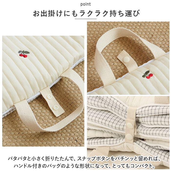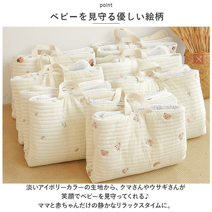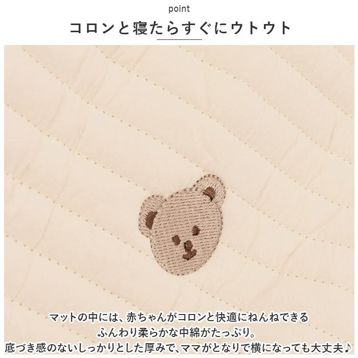 ・マットの中には、赤ちゃんがコロンと快適にねんねできるふんわり柔らかな中綿がたっぷり。底づき感のないしっかりとした厚みで、ママがとなりで横になっても大丈夫♪