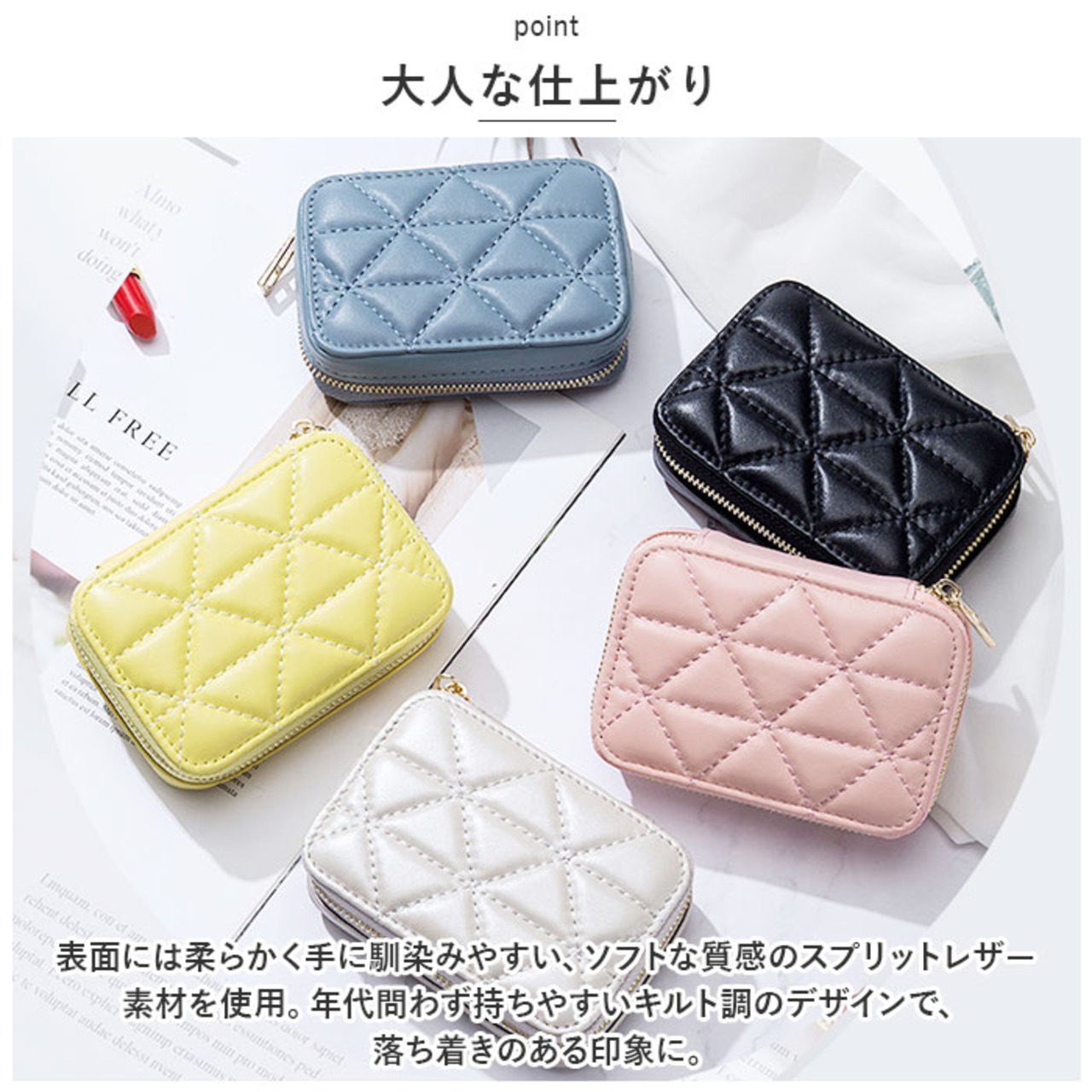 ・表面には柔らかく手に馴染みやすい、ソフトな質感のスプリットレザー素材を使用。年代問わず持ちやすいキルト調のデザインで、落ち着きのある印象に。