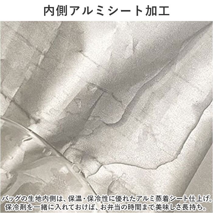 ・バッグの生地内側は、保温・保冷性に優れたアルミ蒸着シート仕上げ。保冷剤を一緒に入れておけば、お弁当の時間まで美味しさ長持ち。