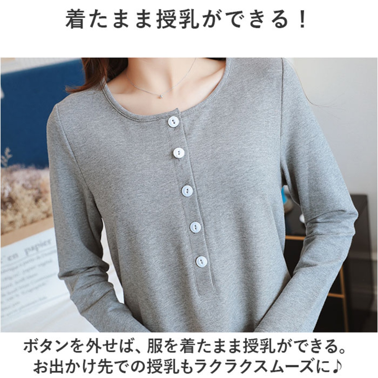・ボタンを外せば、服を着たまま授乳ができる。お出かけ先での授乳もラクラクスムーズに♪