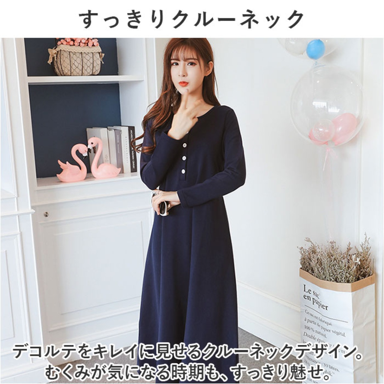 ・デコルテをキレイに見せるクルーネックデザイン。むくみが気になる時期も、すっきり魅せ。