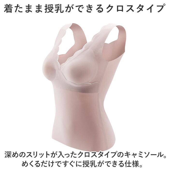 ・深めのスリットが入ったクロスタイプのキャミソール。めくるだけですぐに授乳ができる仕様。