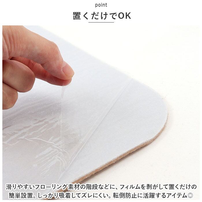 ・滑りやすいフローリング素材の階段などに、フィルムを剥がして置くだけの簡単設置。しっかり吸着してズレにくいので、転倒防止に活躍するアイテム◎