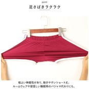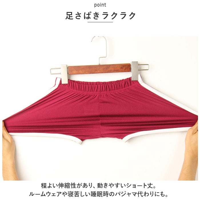 ・程よい伸縮性があり、動きやすいショート丈。ルームウェアや寝苦しい睡眠時のパジャマ代わりにも。