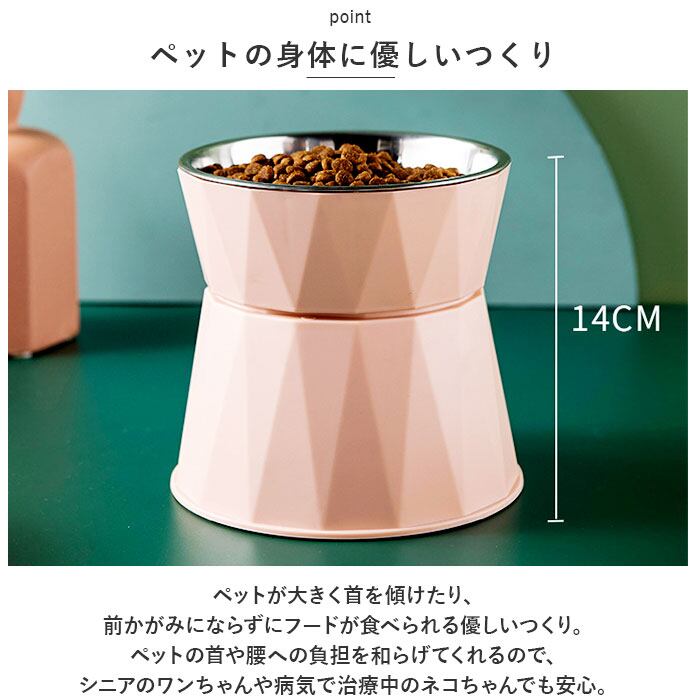 ・ペットが大きく首を傾けたり、前かがみにならずにフードが食べられる優しいつくり。ペットの首や腰への負担を和らげてくれるので、シニアのワンちゃんや病気で治療中のネコちゃんでも安心。