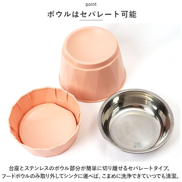 ・台座とステンレスのボウル部分が簡単に切り離せるセパレートタイプ。フードボウルのみ取り外してシンクに運べば、こまめに洗浄できていつでも清潔。