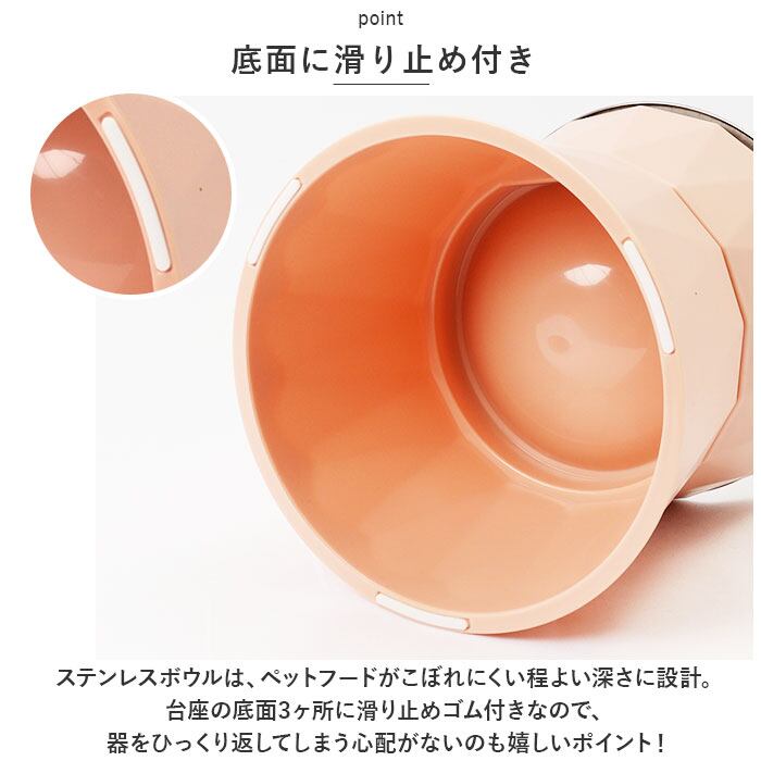 ・ステンレスボウルは、ペットフードがこぼれにくい程よい深さに設計。台座の底面3ヶ所に滑り止めゴム付きなので、器をひっくり返してしまう心配がないのも嬉しいポイント!