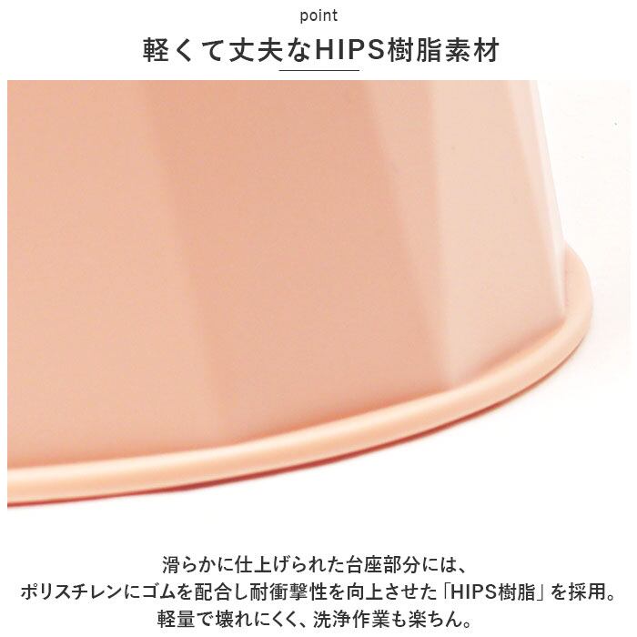 ・滑らかに仕上げられた台座部分には、ポリスチレンにゴムを配合し耐衝撃性を向上させた「HIPS樹脂」を採用。軽量で壊れにくく、洗浄作業も楽ちん。