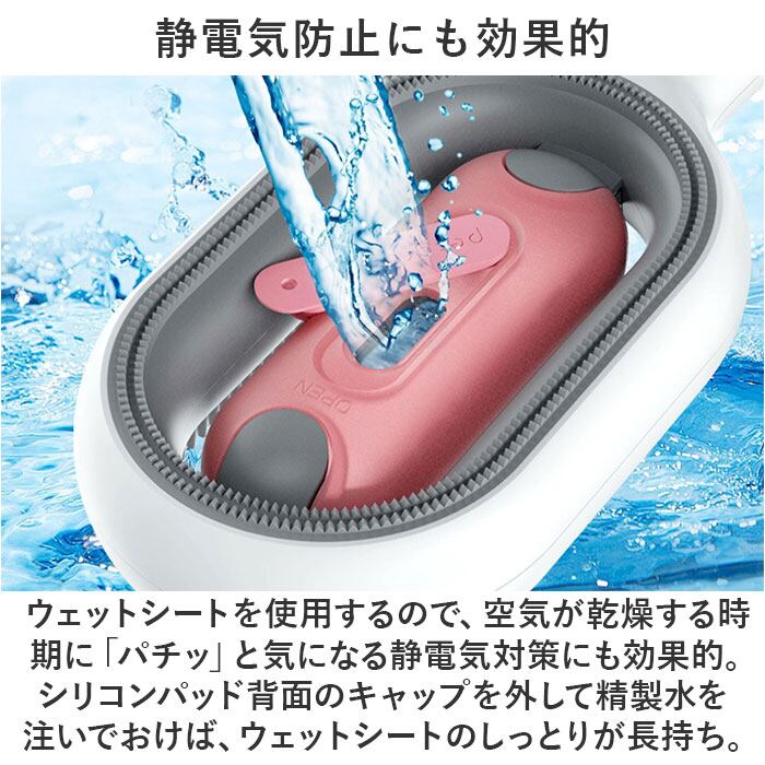 ・ウェットシートを使用するので、空気が乾燥する時期に「パチッ」と気になる静電気対策にも効果的。シリコンパッド背面のキャップを外して精製水を注いでおけば、ウェットシートのしっとりが長持ち。