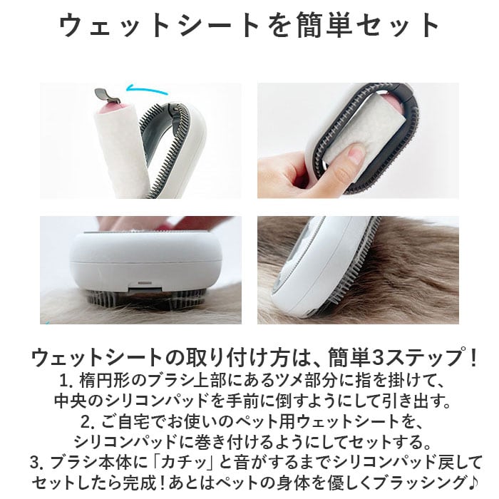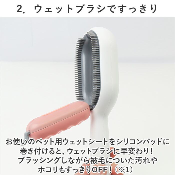 ※1.ペット用ウェットシートをシリコンパッドに巻き付けると、ウェットブラシに。(※本製品にウェットシートは付属しておりません。ご家庭でお使いのペット用ウェットシートを組み合わせてご使用ください。)