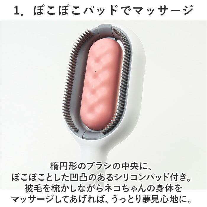 ・楕円形のブラシの中央に、ぽこぽことした凹凸のあるシリコンパッド付き。被毛を梳かしながらネコちゃんの身体をマッサージしてあげれば、うっとり夢見心地に。