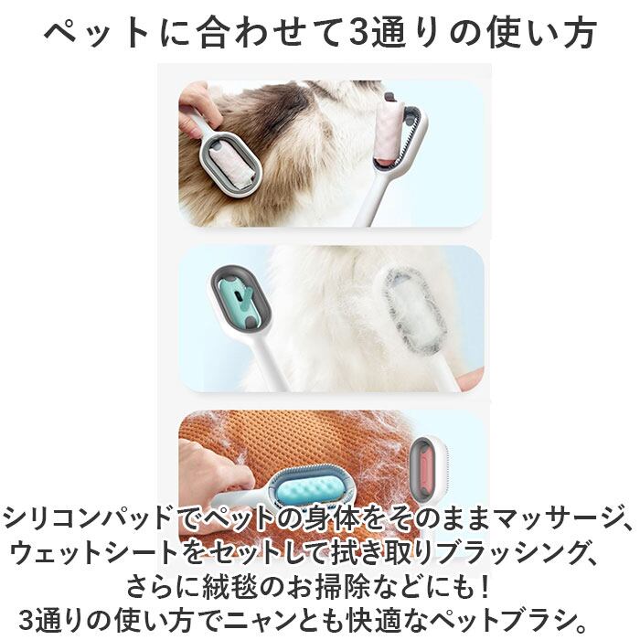 ・シリコンパッドでペットの身体をそのままマッサージ、ウェットシートをセットして拭き取りブラッシング、さらに絨毯のお掃除などにも!3通りの使い方でニャンとも快適なペットブラシ。
