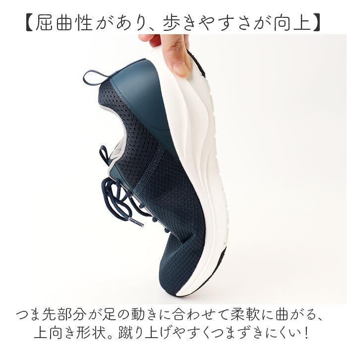 【屈曲性があり、歩きやすさが向上】つま先部分が足の動きに合わせて柔軟に曲がる、上向き形状。蹴り上げやすくつまずきにくい!