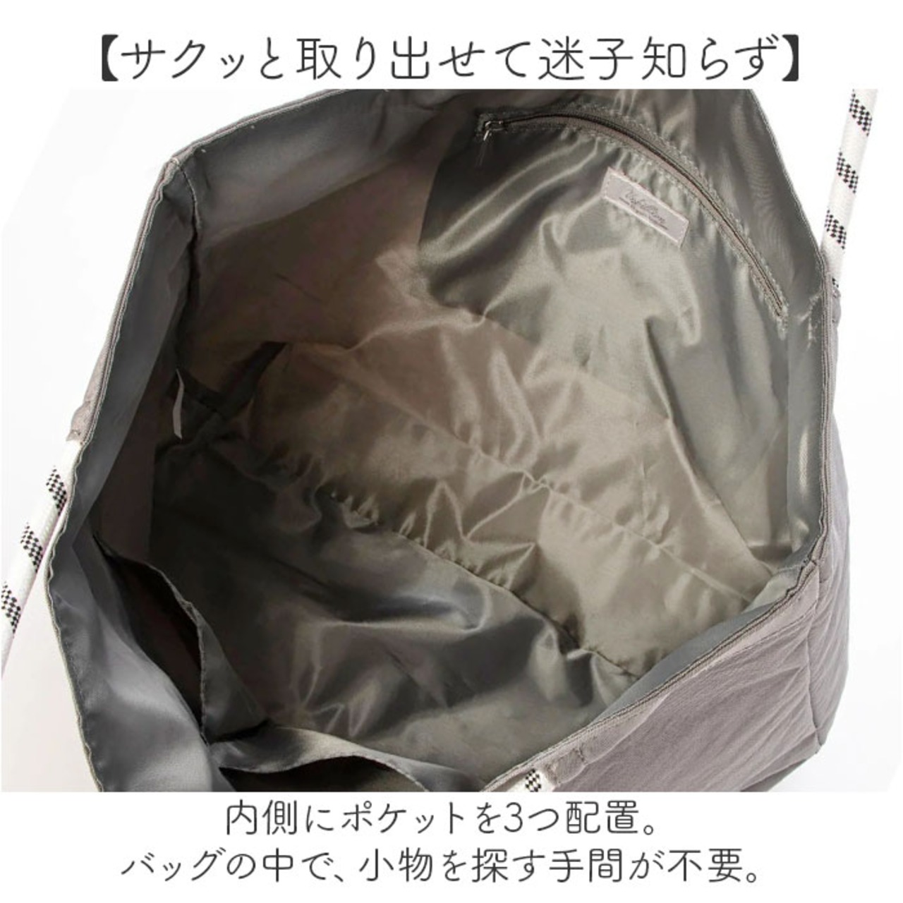 ・内側にポケットを3つ配置。バッグの中で、小物を探す手間が不要。