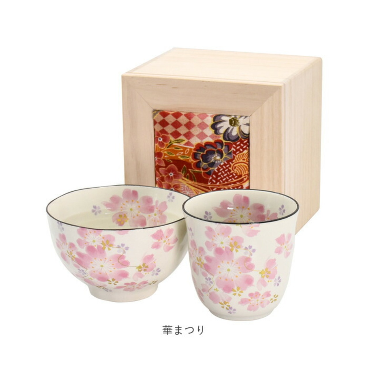 ・可憐な器とちりめん木箱の上品セット。特別な日を彩る「飯碗湯呑 ちりめん木箱」が登場。
