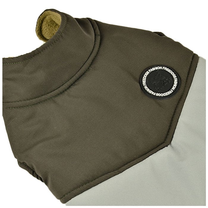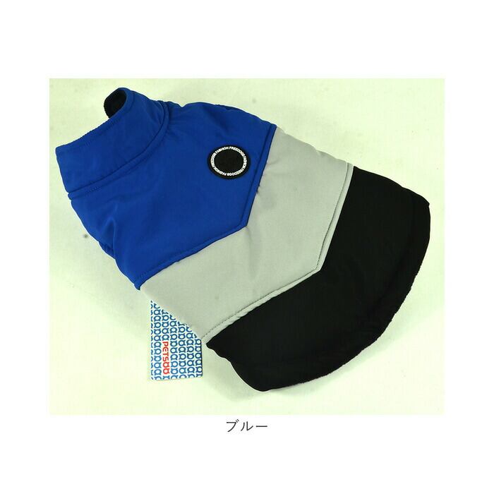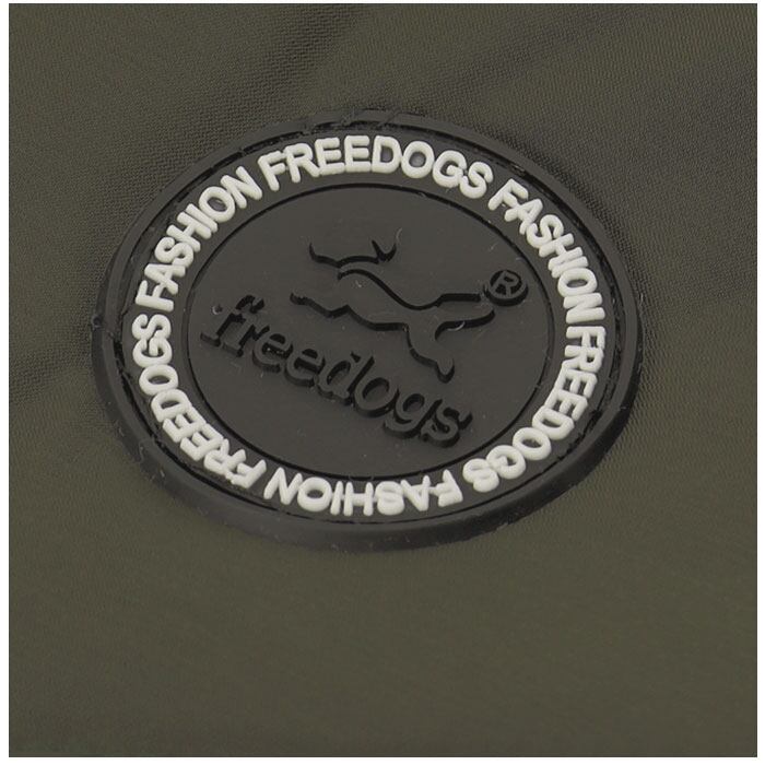 ・3色の生地を鮮やかに切り替えたトライカラーデザインが、飼い主さんの秋冬ファッションに素敵にシンクロ。「FREEDOGS FASHION」のラバーネームがデザインのワンポイント。
