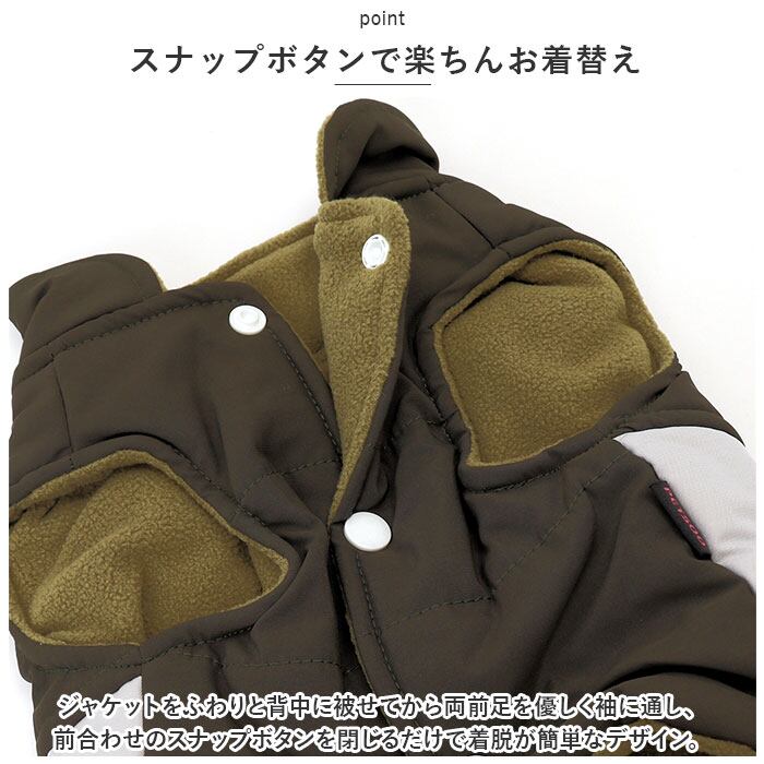 ・ジャケットをふわりと背中に被せてから両前足を優しく袖に通し、前合わせのスナップボタンを閉じるだけで着脱が簡単なデザイン。
