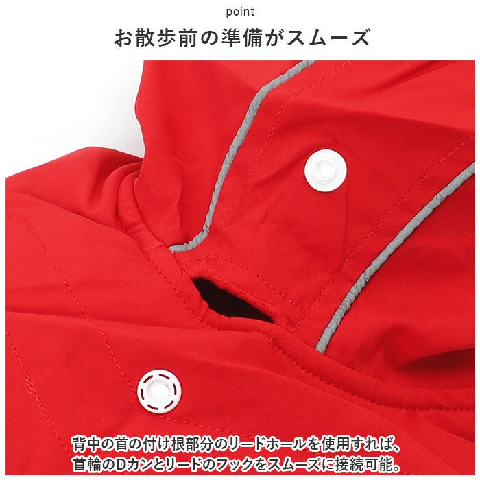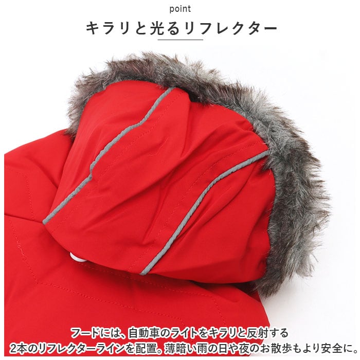 ・フードには、自動車のライトをキラリと反射する2本のリフレクターラインを配置。薄暗い雨の日や夜のお散歩もより安全に。