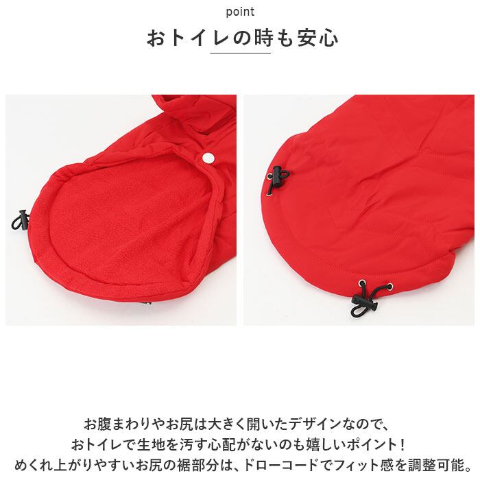 ・お腹まわりやお尻は大きく開いたデザインなので、おトイレで生地を汚す心配がないのも嬉しいポイント!めくれ上がりやすいお尻の裾部分は、ドローコードでフィット感を調整可能。