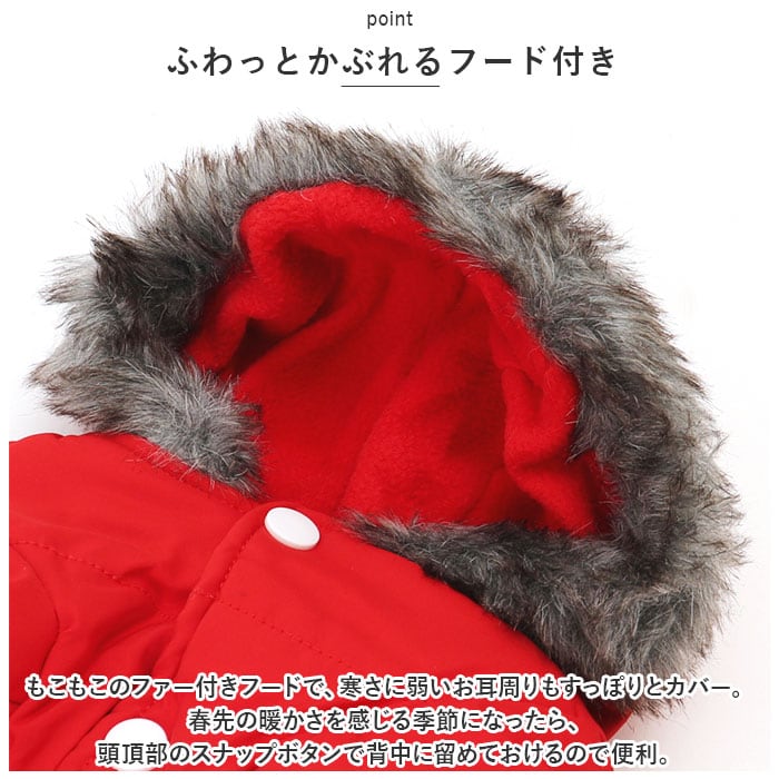 ・もこもこのファー付きフードで、寒さに弱いお耳周りもすっぽりとカバー。春先の暖かさを感じる季節になったら、頭頂部のスナップボタンで背中に留めておけるので便利。