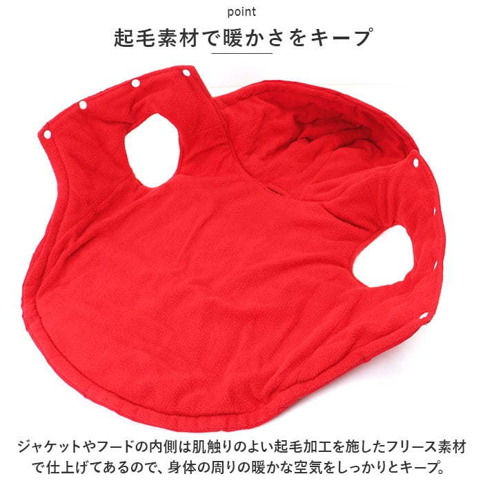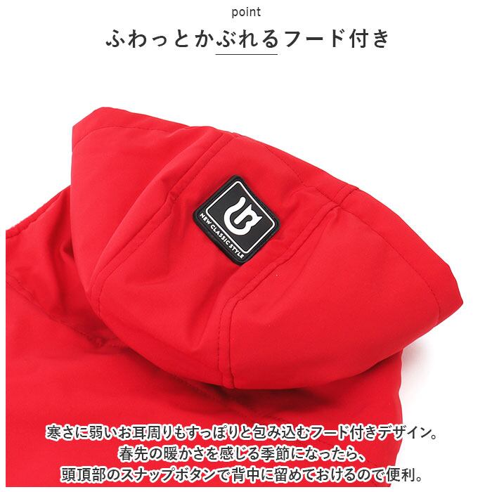 ・寒さに弱いお耳周りもすっぽりと包み込むフード付きデザイン。春先の暖かさを感じる季節になったら、頭頂部のスナップボタンで背中に留めておけるので便利。