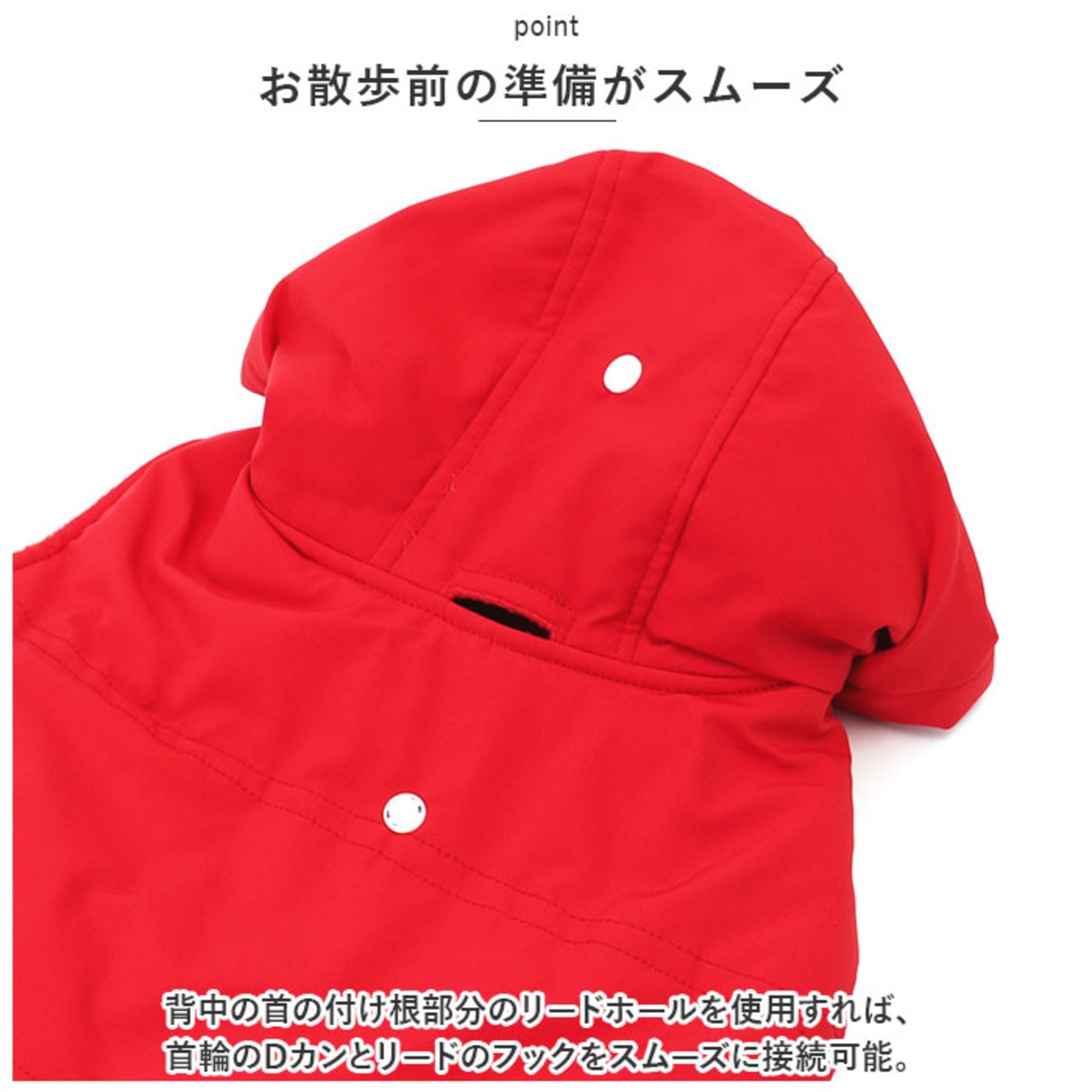 ・背中の首の付け根部分のリードホールを使用すれば、首輪のDカンとリードのフックをスムーズに接続可能。