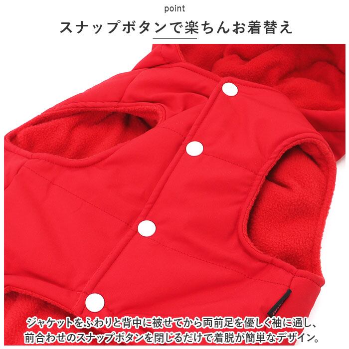 ・ジャケットをふわりと背中に被せてから両前足を優しく袖に通し、前合わせのスナップボタンを閉じるだけで着脱が簡単なデザイン。