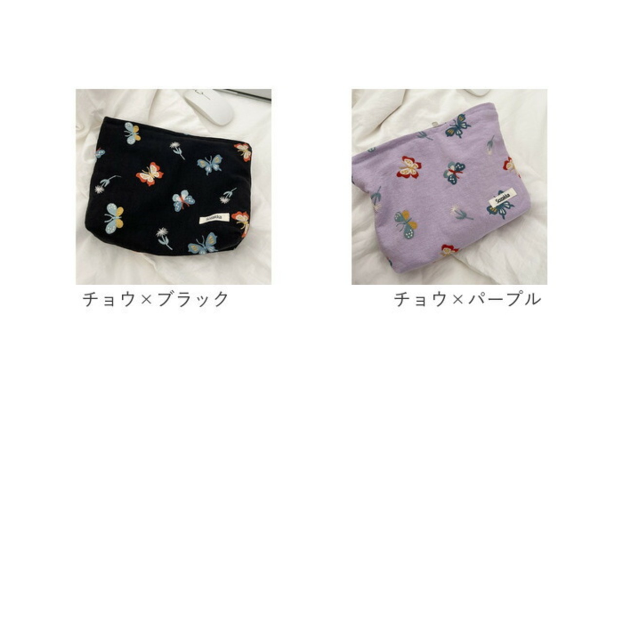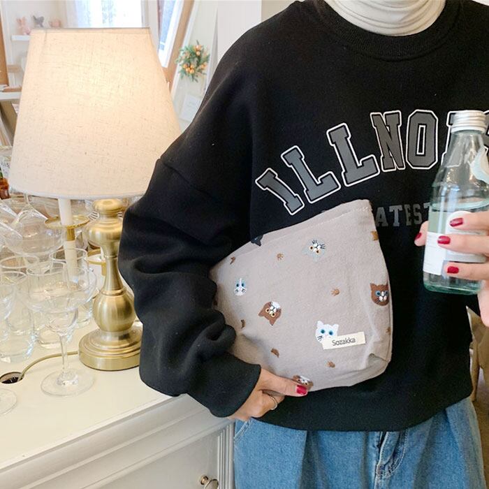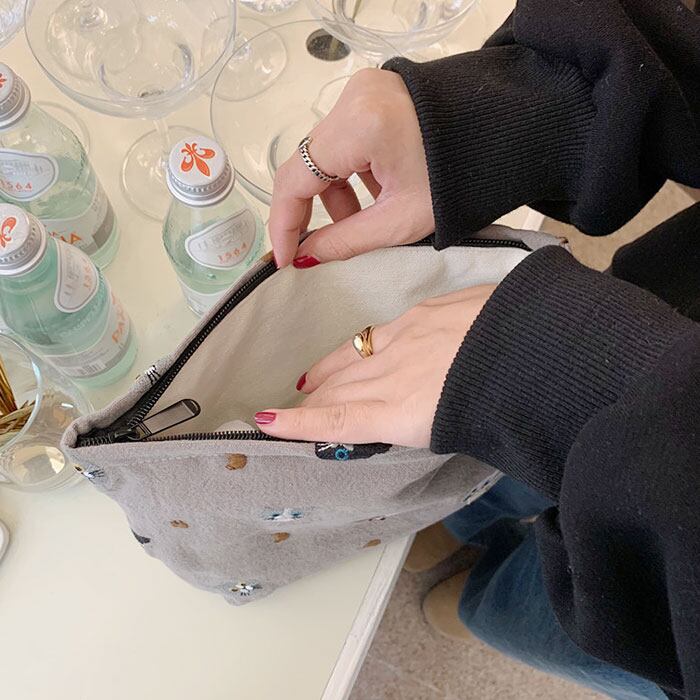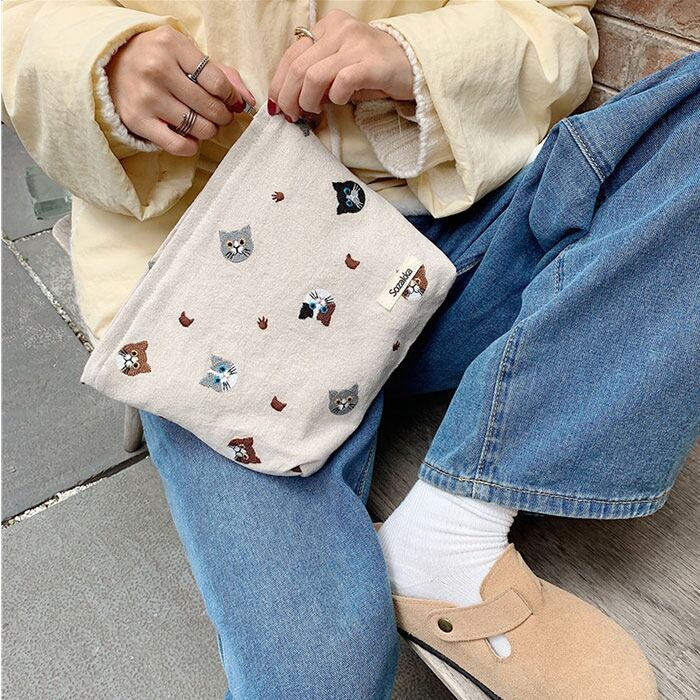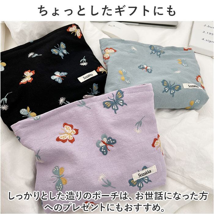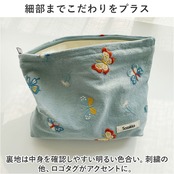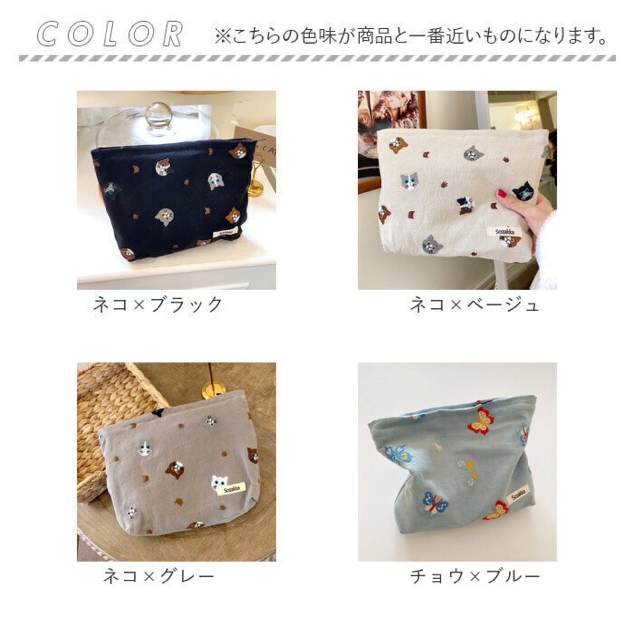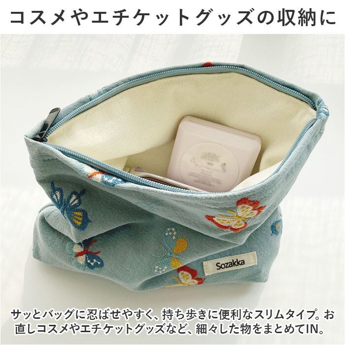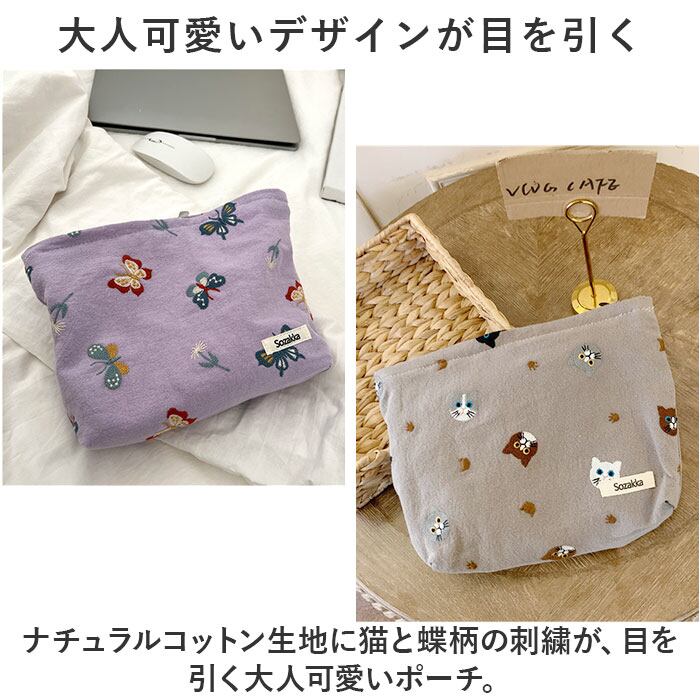 ・ナチュラルコットン生地に猫と蝶柄の刺繍が、目を引く大人可愛いポーチ。