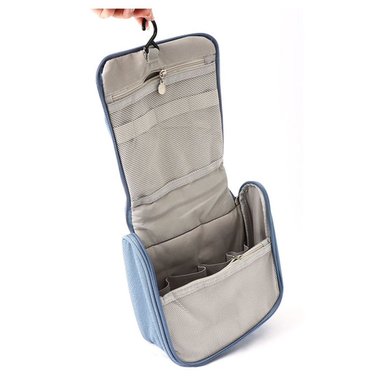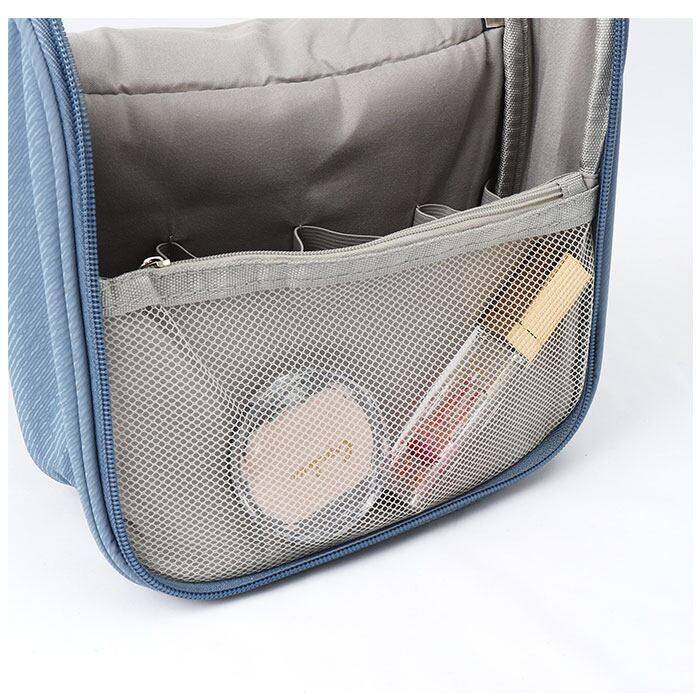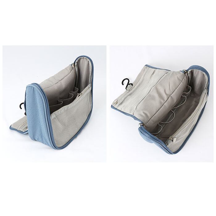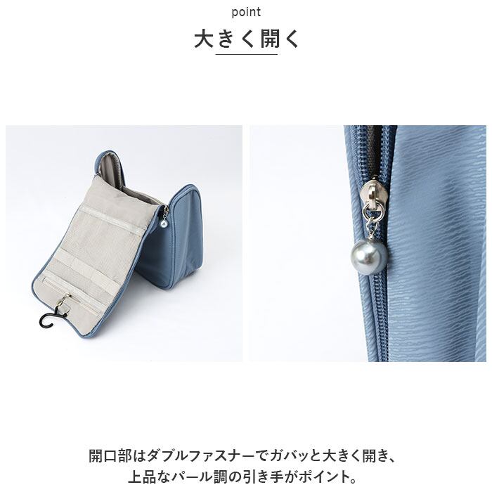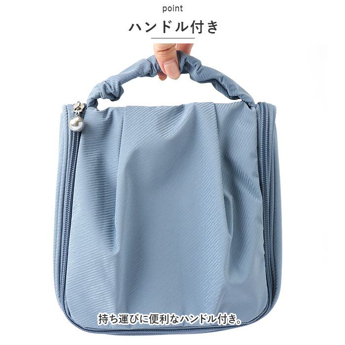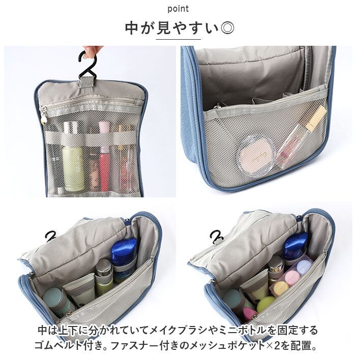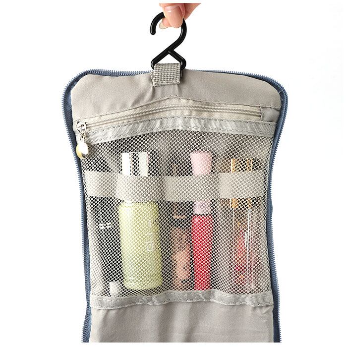 ・コスメやメイク道具がすっきり収納できる、コスメポーチ。フックでホテルの洗面台に吊るせば、便利な壁掛け収納に変身!
