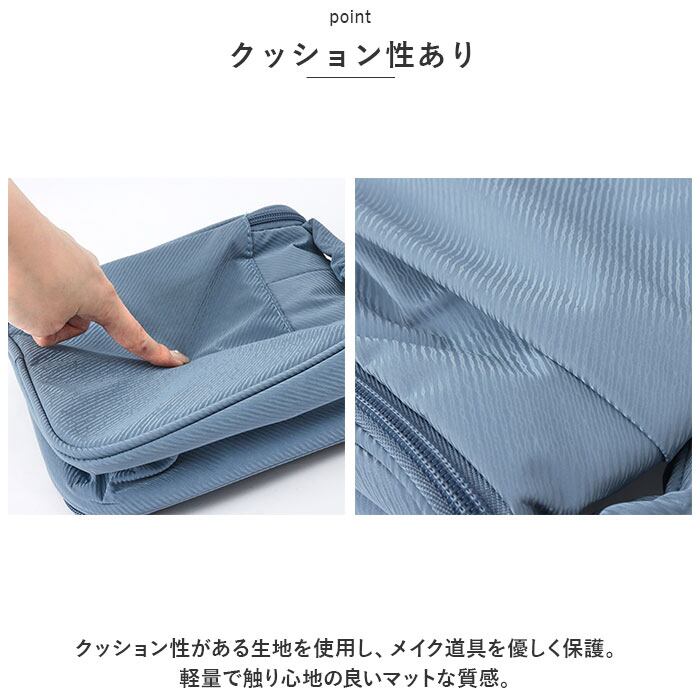 ・クッション性がある生地を使用し、メイク道具を優しく保護。軽量で触り心地の良いマットな質感。