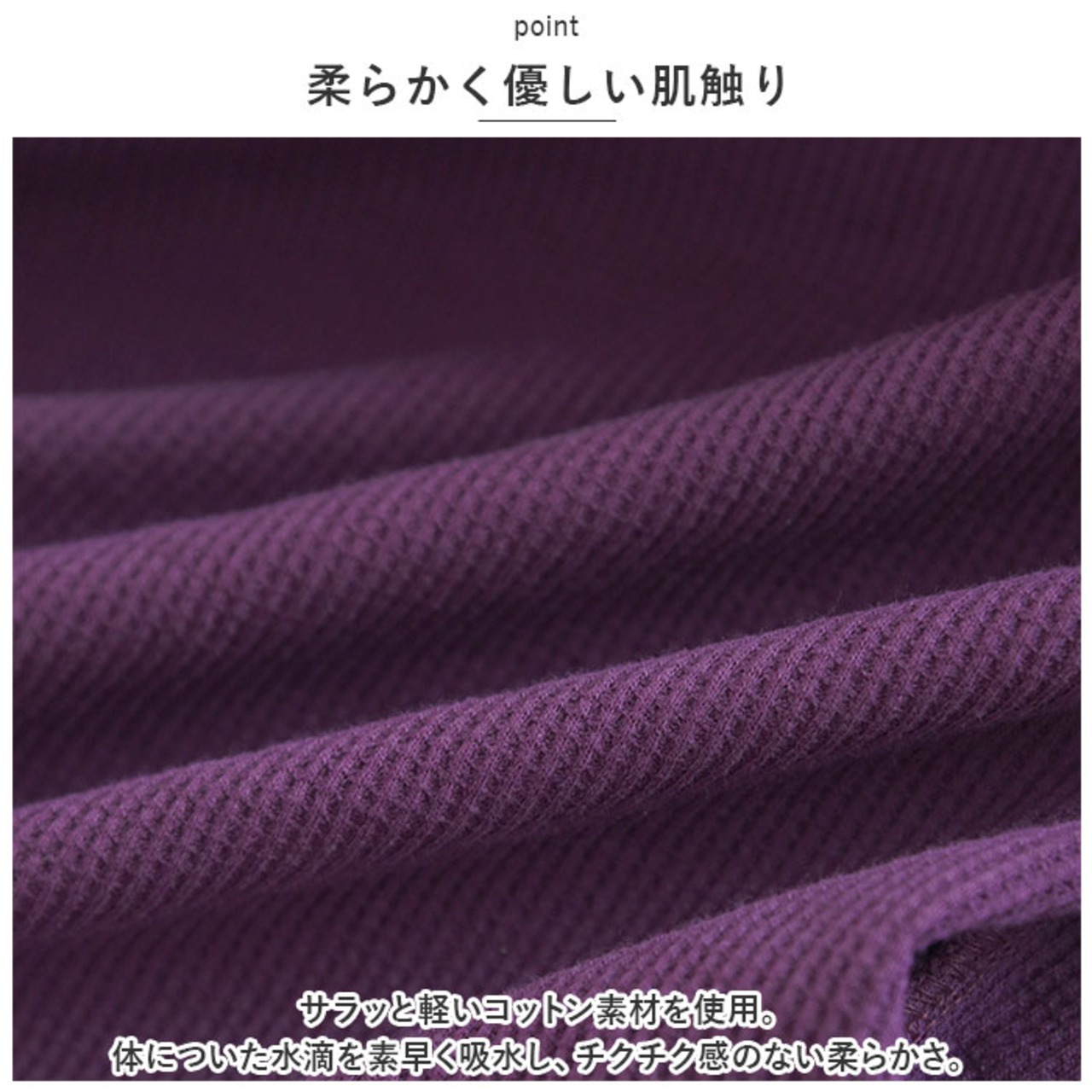 ・サラッと軽いコットン素材を使用。体についた水滴を素早く吸水し、チクチク感のない柔らかさ。