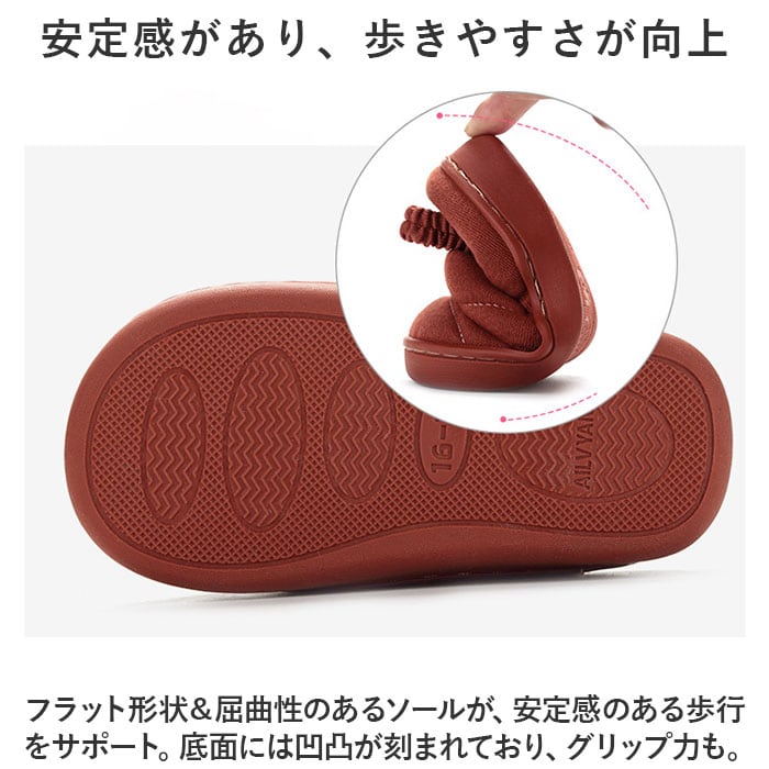 ・つま先を覆って、障害物などから優しくガード。小さなお子さまが履いても、つまずきにくく安心。