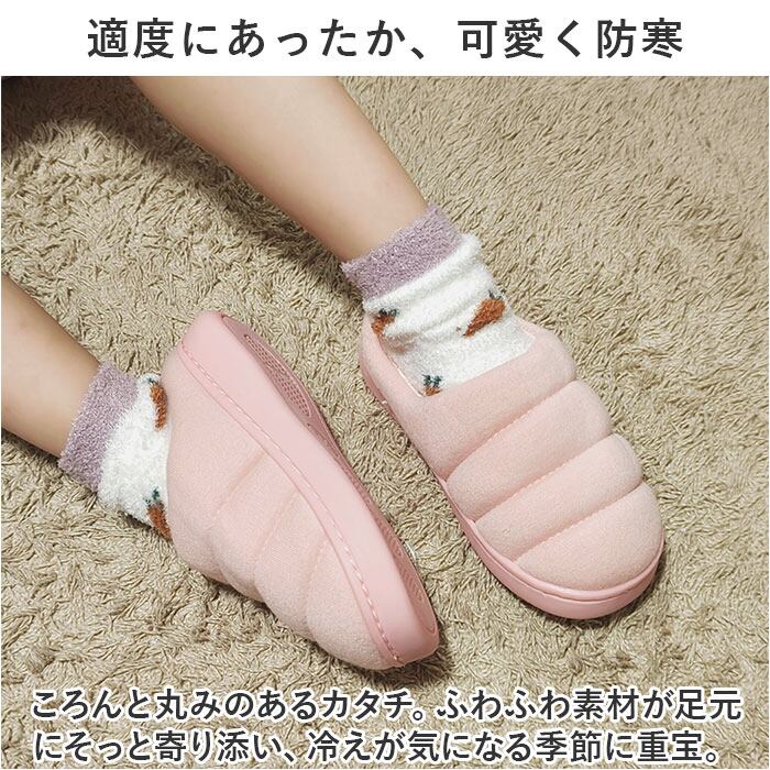 ・ころんと丸みのあるカタチ。ふわふわ素材が足元にそっと寄り添い、冷えが気になる季節に重宝。